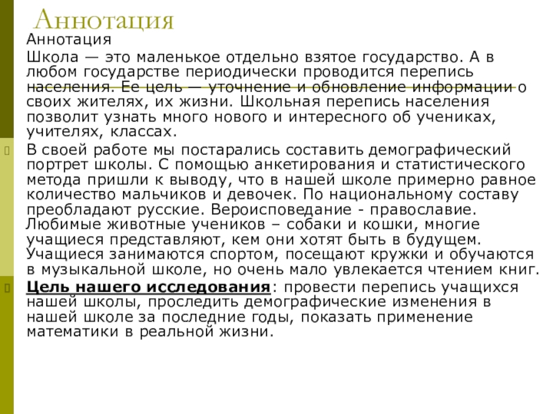 Цель нашего исследования: провести перепись учащихся нашей школы, проследить демографические изменения в нашей школе за последние годы, показать применение математики в реальной жизни.