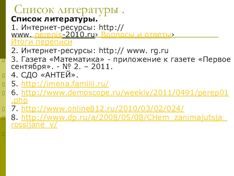 1. Интернет-ресурсы: http:// www. perepis-2010.ru› Вопросы и ответы›Итоги переписи