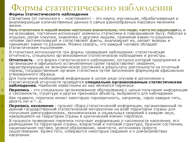 В статистике используются три формы проведения наблюдения: статистическая отчетность, специально организованное статистическое наблюдение и регистры.