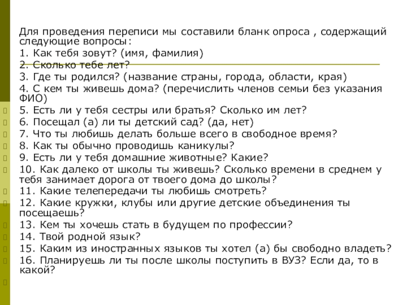 Для проведения переписи мы составили бланк опроса , содержащий следующие вопросы: