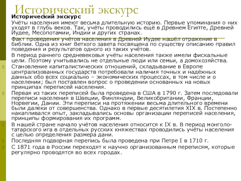 В нашей стране начало учётов населения относится к IX в. В период монголо-татарского ига в отдельных русских княжествах проводились учёты населения с целью определения размера дани.