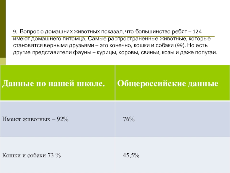 9. Вопрос о домашних животных показал, что большинство ребят – 124 имеют