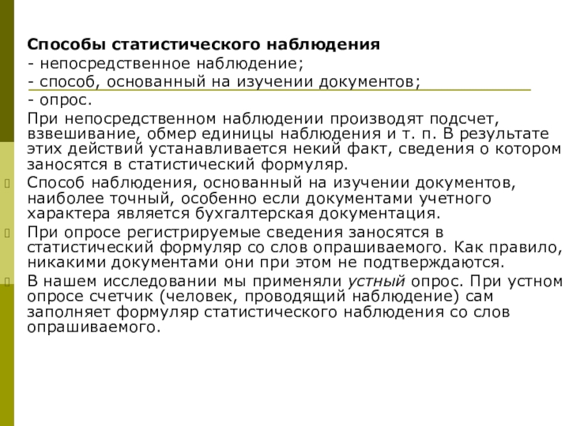 непосредственном наблюдении производят подсчет, взвешивание, обмер единицы наблюдения и т. п. В результате этих действий устанавливается некий факт, сведения о котором заносятся в статистический формуляр.