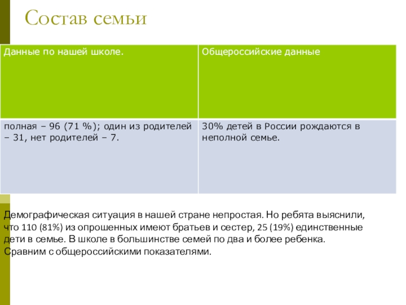 110 (81%) из опрошенных имеют братьев и сестер, 25 (19%) единственные дети в семье. В школе в большинстве семей по два и более ребенка. Сравним с общероссийскими показателями.