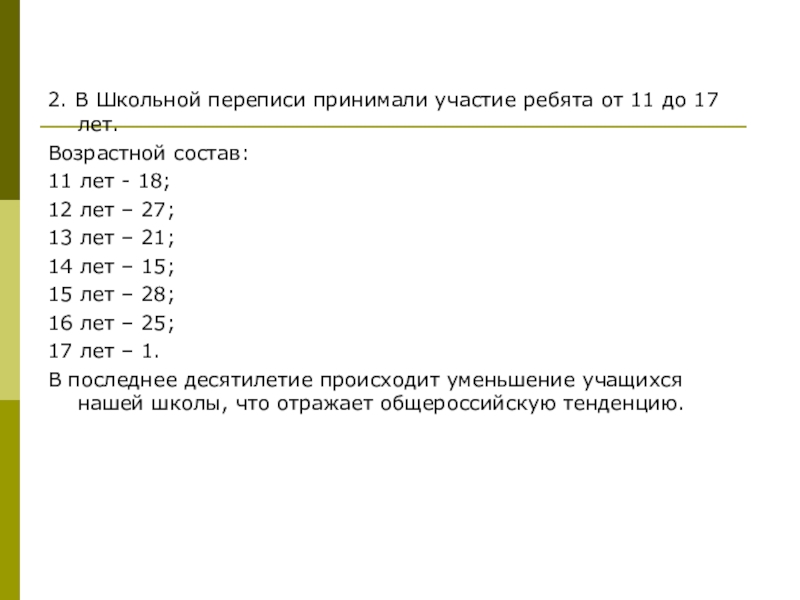 2. В Школьной переписи принимали участие ребята от 11 до 17 лет.