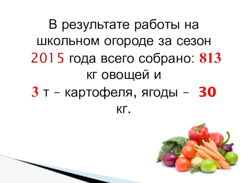 В результате работы на школьном огороде за сезон 2015 года всего собрано: 813 кг овощей и 3 т – картофеля, ягоды – 30 кг.