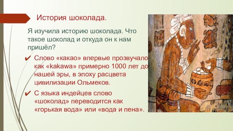 Слово «какао» впервые прозвучало как «kakawa» примерно 1000 лет до нашей эры, в эпоху расцвета цивилизации Ольмеков.