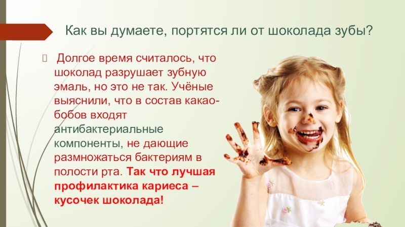 Слайд 13Как вы думаете, портятся ли от шоколада зубы?