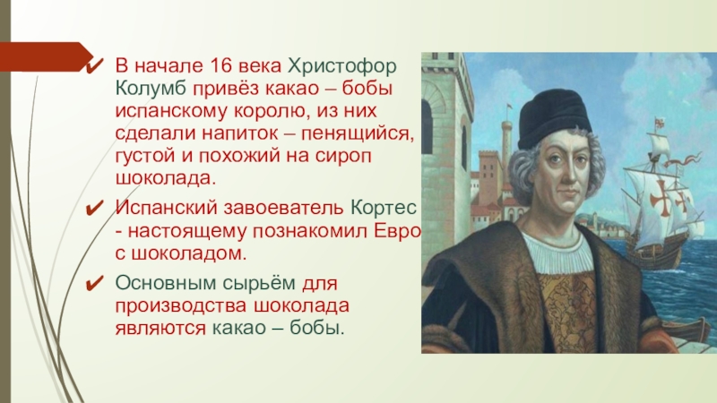 Слайд 8В начале 16 века Христофор Колумб привёз какао – бобы испанскому