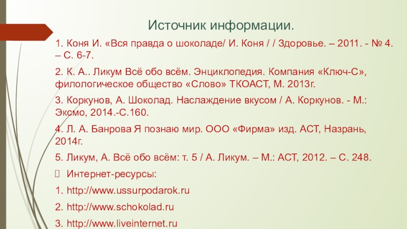1. Коня И. «Вся правда о шоколаде/ И. Коня