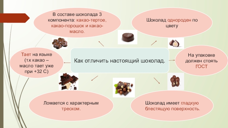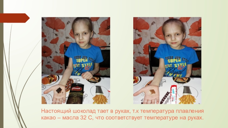 Слайд 15Настоящий шоколад тает в руках, т.к температура плавления какао – масла