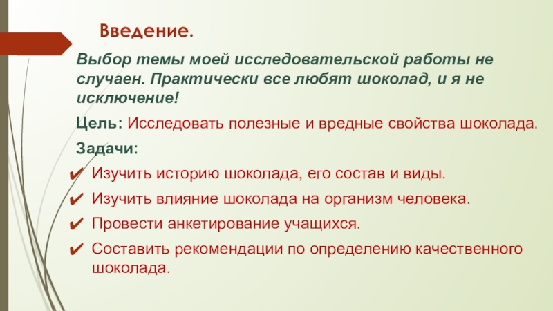 Цель: Исследовать полезные и вредные свойства шоколада.