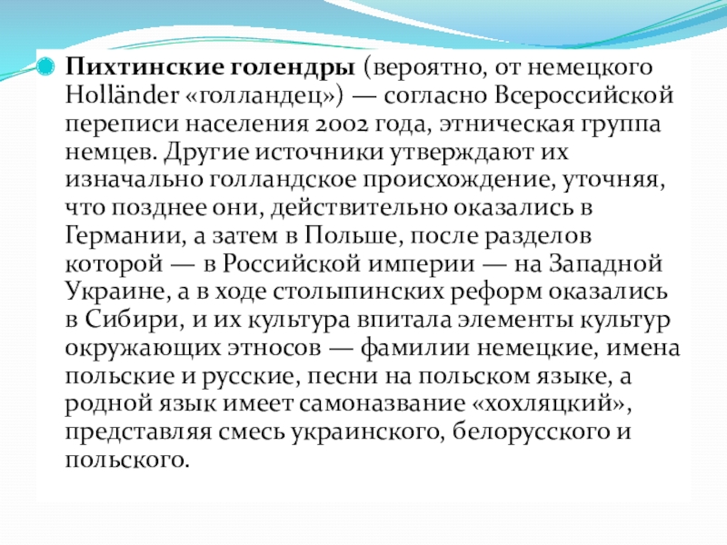 Слайд 4Пихтинские голендры (вероятно, от немецкого Holländer «голландец») — согласно Всероссийской переписи населения 2002