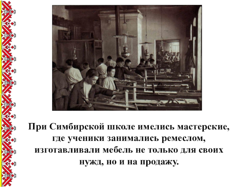 Слайд 8При Симбирской школе имелись мастерские, где ученики занимались ремеслом, изготавливали мебель