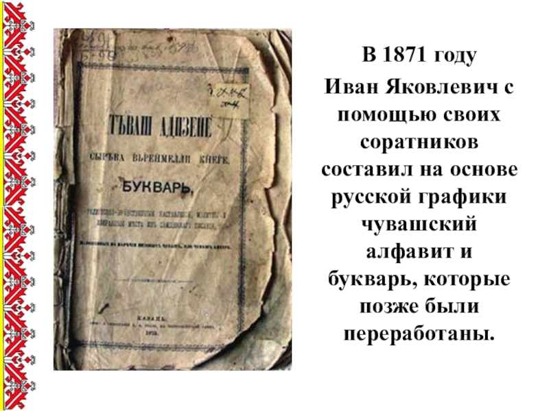 В 1871 году Иван Яковлевич с помощью своих соратников составил на основе русской графики чувашский алфавит и