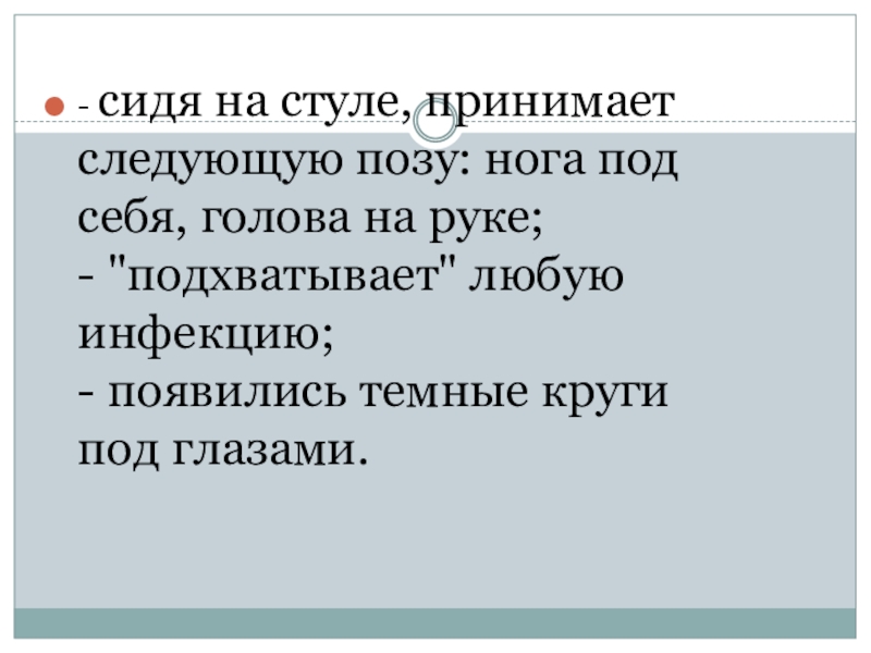 Слайд 7- сидя на стуле, принимает следующую позу: нога под себя, голова