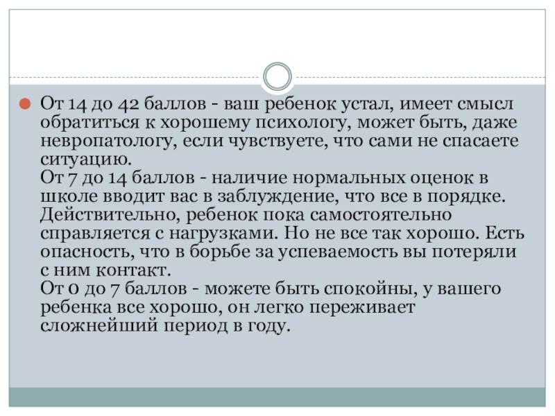 Слайд 8От 14 до 42 баллов - ваш ребенок устал, имеет смысл