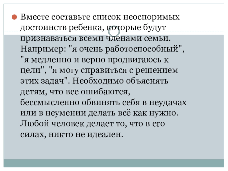 Слайд 13Вместе составьте список неоспоримых достоинств ребенка, которые будут признаваться всеми членами