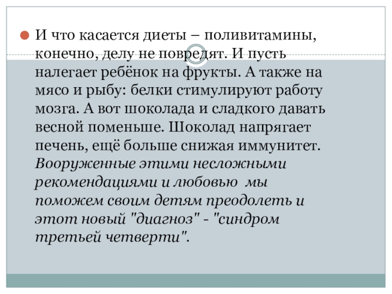 пусть налегает ребёнок на фрукты. А также на мясо и рыбу: белки стимулируют работу мозга. А вот шоколада и сладкого давать весной поменьше. Шоколад напрягает печень, ещё больше снижая иммунитет. Вооруженные этими несложными рекомендациями и любовью мы поможем своим детям преодолеть и этот новый "диагноз" - "синдром третьей четверти".