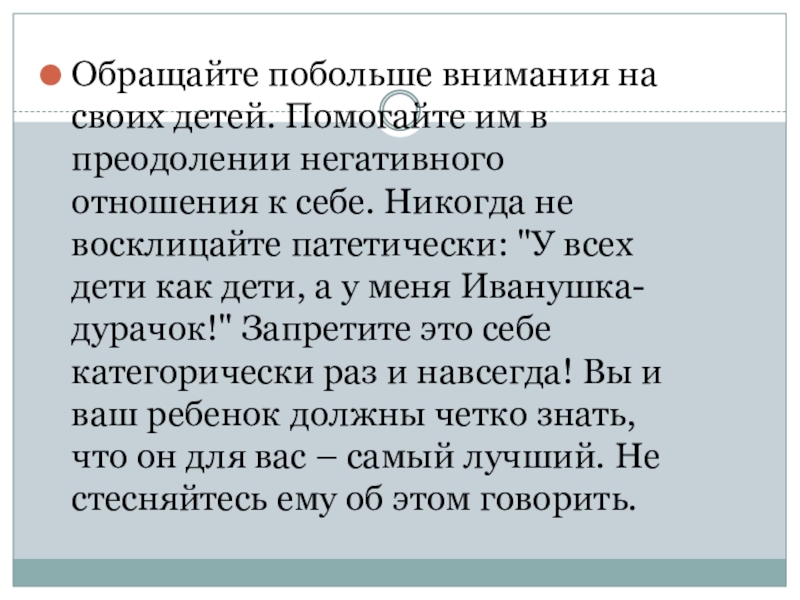 отношения к себе. Никогда не восклицайте патетически: "У всех дети как дети, а у меня Иванушка-дурачок!" Запретите это себе категорически раз и навсегда! Вы и ваш ребенок должны четко знать, что он для вас – самый лучший. Не стесняйтесь ему об этом говорить.