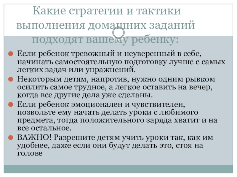 Слайд 18 Какие стратегии и тактики выполнения домашних заданий подходят вашему ребенку:
