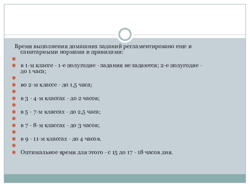 Слайд 15 Время выполнения домашних заданий регламентировано еще и санитарными нормами и