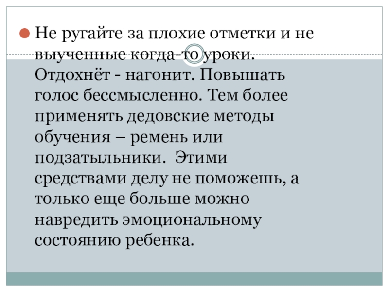 Слайд 10Не ругайте за плохие отметки и не выученные когда-то уроки. Отдохнёт