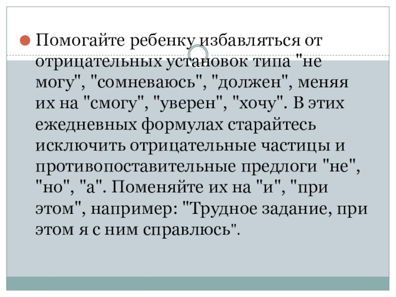 Слайд 11Помогайте ребенку избавляться от отрицательных установок типа "не могу", "сомневаюсь", "должен",