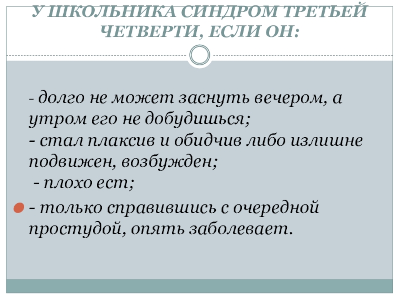 Слайд 2У ШКОЛЬНИКА СИНДРОМ ТРЕТЬЕЙ ЧЕТВЕРТИ, ЕСЛИ ОН: