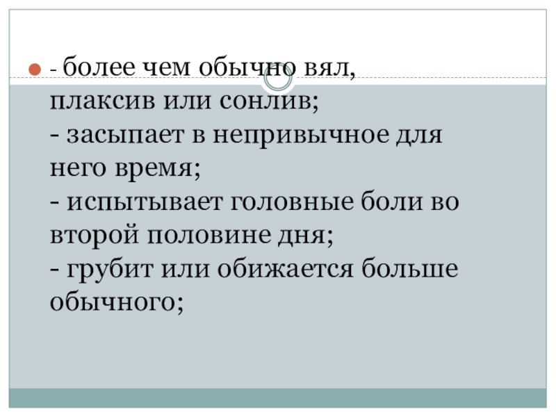 Слайд 5- более чем обычно вял, плаксив или сонлив;