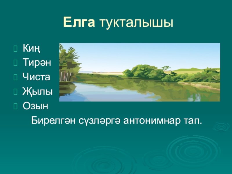 Елга тукталышыКиңТирәнЧистаҖылыОзын   Бирелгән сүзләргә антонимнар тап.
