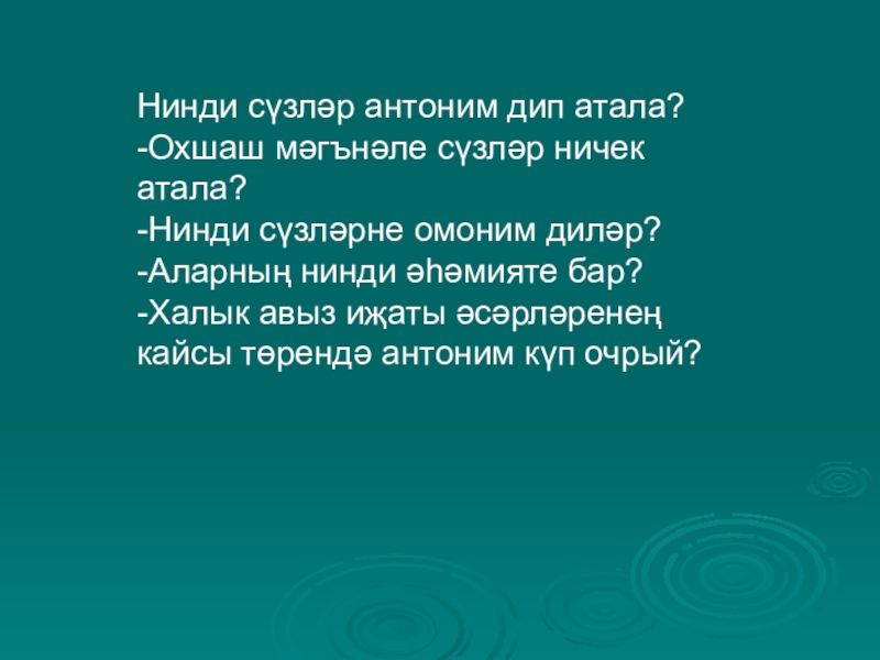 Нинди сүзләр антоним дип атала? -Охшаш мәгънәле сүзләр ничек атала? -Нинди сүзләрне омоним диләр? -Аларның нинди әһәмияте