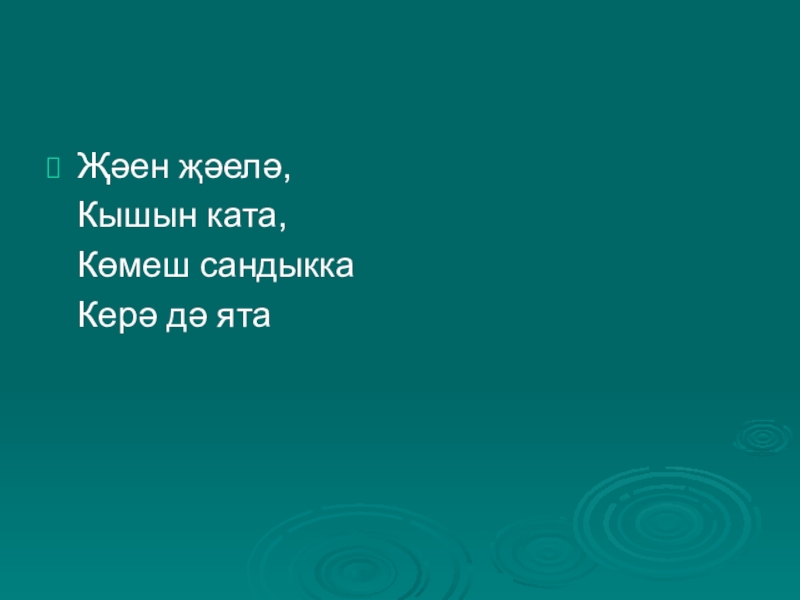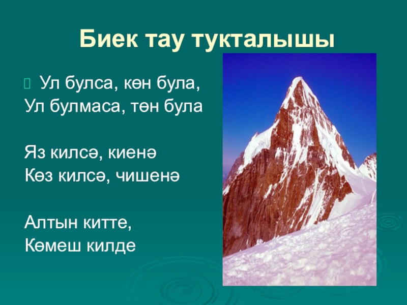 Биек тау тукталышыУл булса, көн була,Ул булмаса, төн була Яз килсә, киенәКөз килсә, чишенәАлтын китте,Көмеш килде