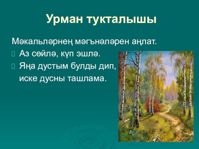 Урман тукталышыМәкальләрнең мәгънәләрен аңлат. Аз сөйлә, күп эшлә.Яңа дустым булды дип,  иске дусны ташлама.