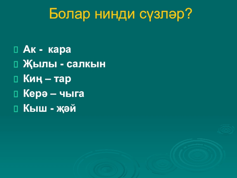 Болар нинди сүзләр? Ак - караҖылы - салкынКиң – тарКерә – чыгаКыш - җәй