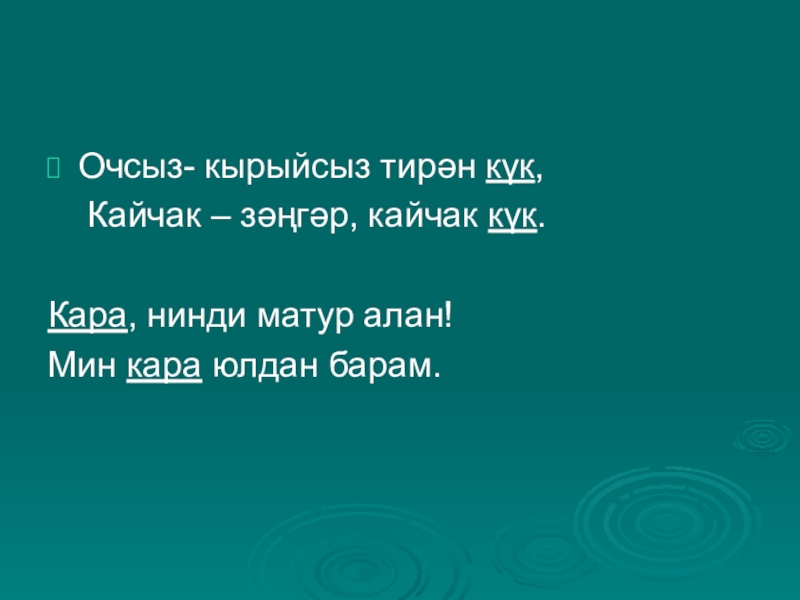 Очсыз- кырыйсыз тирән күк,  Кайчак – зәңгәр, кайчак күк.Кара, нинди матур алан!Мин кара юлдан барам.