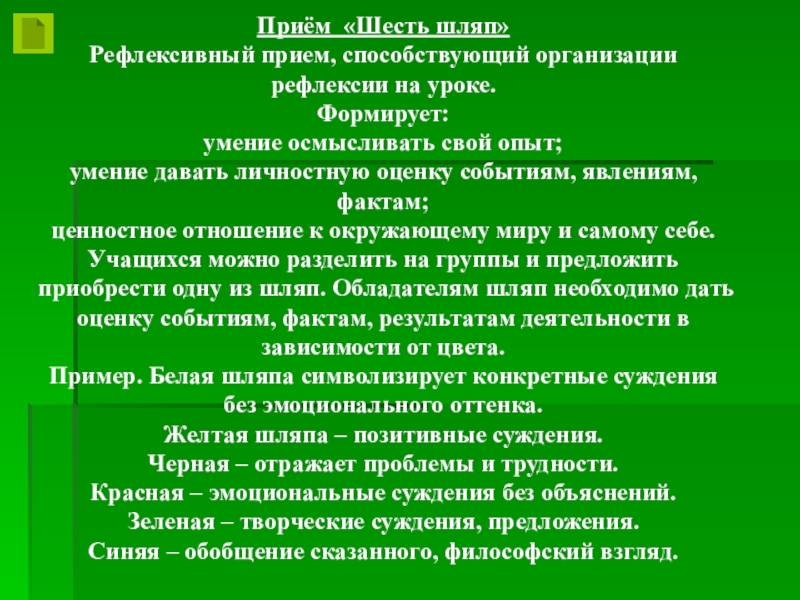 Учащихся можно разделить на группы и предложить приобрести одну из шляп. Обладателям шляп необходимо дать оценку событиям, фактам, результатам деятельности в зависимости от цвета.