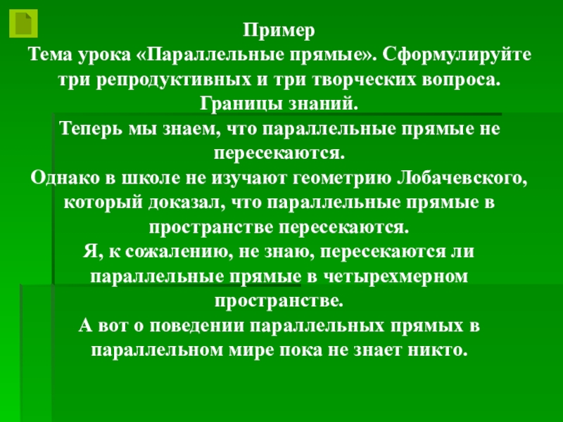 Тема урока «Параллельные прямые». Сформулируйте три репродуктивных и три творческих