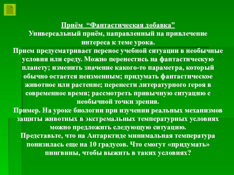 Прием предусматривает перенос учебной ситуации в необычные условия или среду. Можно перенестись на фантастическую планету; изменить значение какого-то параметра, который обычно остается неизменным; придумать фантастическое животное или растение; перенести литературного героя в современное время; рассмотреть привычную ситуацию с необычной точки зрения.