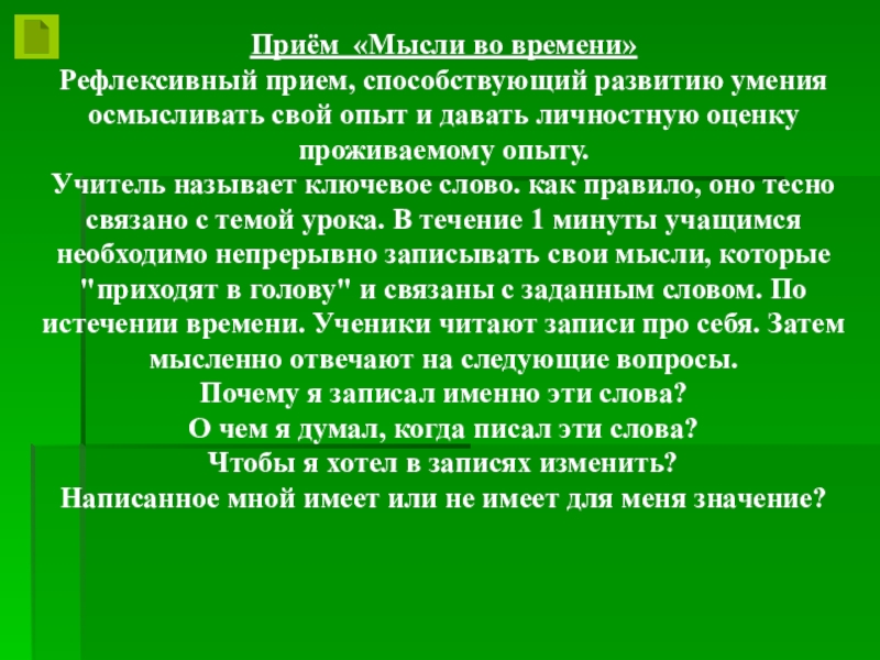 Учитель называет ключевое слово. как правило, оно тесно связано с темой урока. В течение 1 минуты учащимся необходимо непрерывно записывать свои мысли, которые "приходят в голову" и связаны с заданным словом. По истечении времени. Ученики читают записи про себя. Затем мысленно отвечают на следующие вопросы.