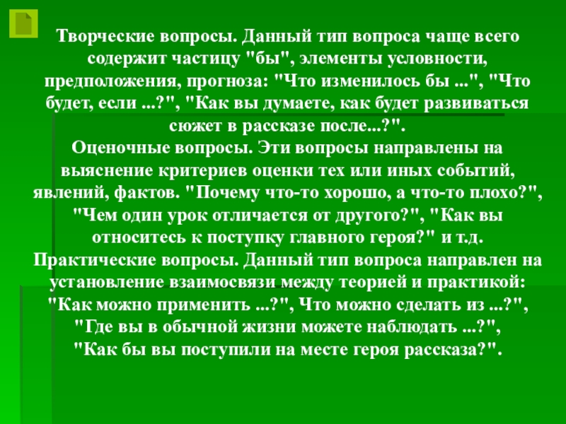 Слайд 87Творческие вопросы. Данный тип вопроса чаще всего содержит частицу "бы", элементы