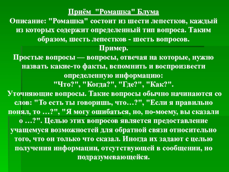 Уточняющие вопросы. Такие вопросы обычно начинаются со слов: "То есть ты говоришь, что…?", "Если я правильно понял, то …?", "Я могу ошибаться, но, по-моему, вы сказали о …?". Целью этих вопросов является предоставление учащемуся возможностей для обратной связи относительно того, что он только что сказал. Иногда их задают с целью получения информации, отсутствующей в сообщении, но подразумевающейся.