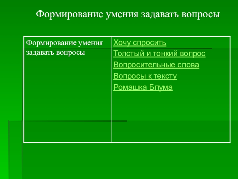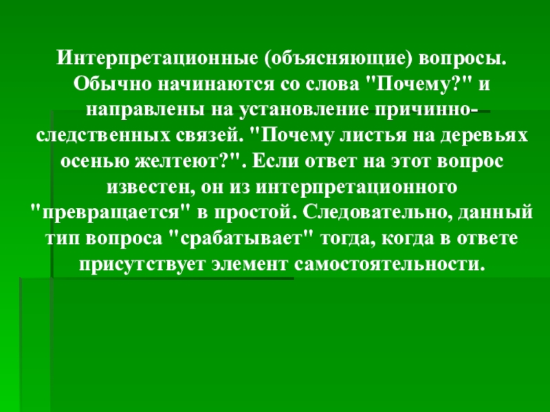 установление причинно-следственных связей. "Почему листья на деревьях осенью желтеют?". Если ответ на этот вопрос известен, он из интерпретационного "превращается" в простой. Следовательно, данный тип вопроса "срабатывает" тогда, когда в ответе присутствует элемент самостоятельности.