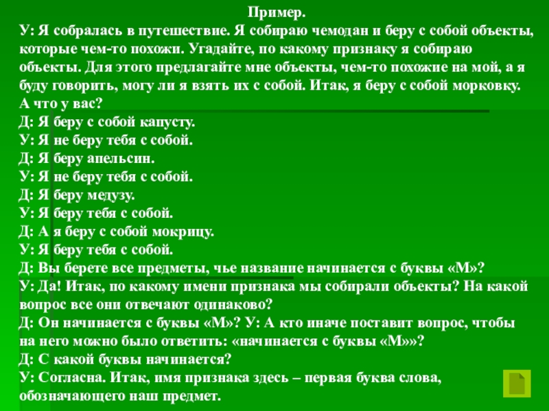 с собой объекты, которые чем-то похожи. Угадайте, по какому признаку я собираю объекты. Для этого предлагайте мне объекты, чем-то похожие на мой, а я буду говорить, могу ли я взять их с собой. Итак, я беру с собой морковку. А что у вас?