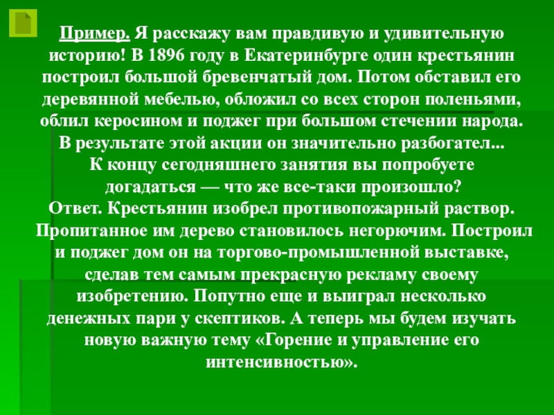 Ответ. Крестьянин изобрел противопожарный раствор. Пропитанное им дерево становилось негорючим. Построил и поджег дом он на торгово-промышленной выставке, сделав тем самым прекрасную рекламу своему изобретению. Попутно еще и выиграл несколько денежных пари у скептиков. А теперь мы будем изучать новую важную тему «Горение и управление его интенсивностью».