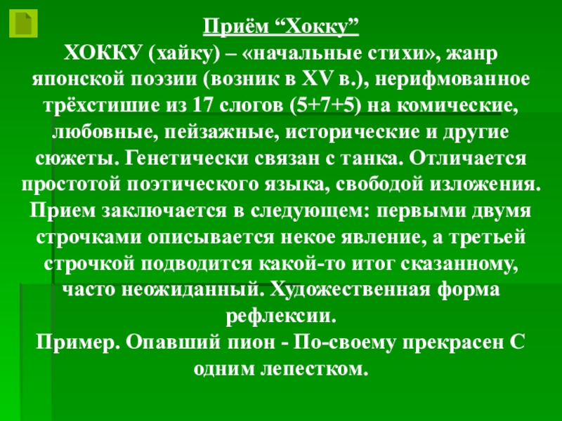 XV в.), нерифмованное трёхстишие из 17 слогов (5+7+5) на комические, любовные, пейзажные, исторические и другие сюжеты. Генетически связан с танка. Отличается простотой поэтического языка, свободой изложения. Прием заключается в следующем: первыми двумя строчками описывается некое явление, а третьей строчкой подводится какой-то итог сказанному, часто неожиданный. Художественная форма рефлексии.