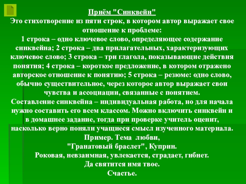 Составление синквейна – индивидуальная работа, но для начала нужно составить его всем классом. Можно включить синквейн и в домашнее задание, тогда при проверке учитель оценит, насколько верно поняли учащиеся смысл изученного материала.
