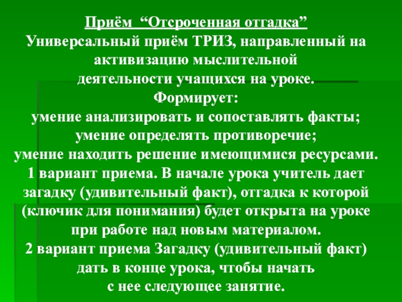 1 вариант приема. В начале урока учитель дает загадку (удивительный факт), отгадка к которой (ключик для понимания) будет открыта на уроке при работе над новым материалом.