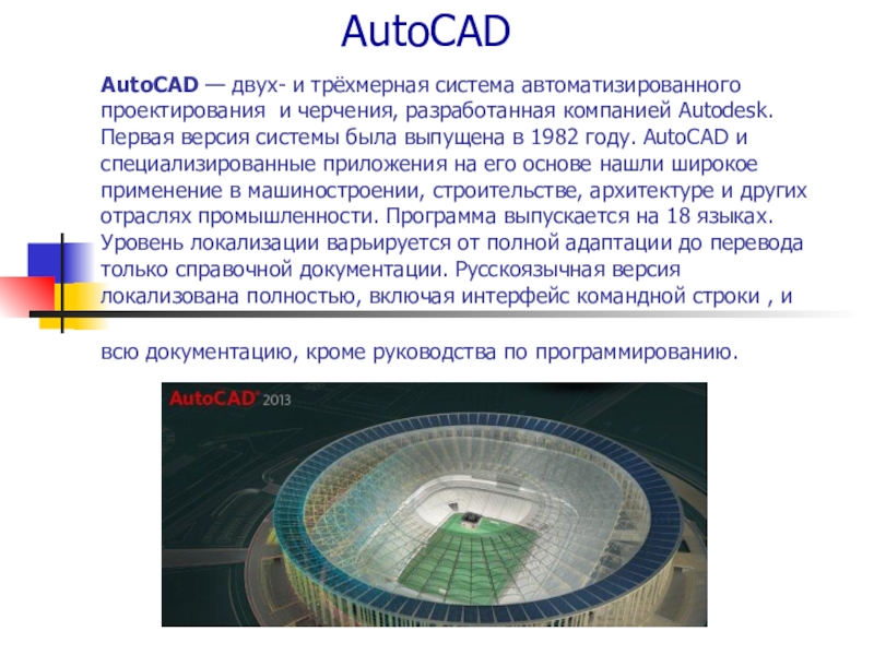 Слайд 24AutoCAD — двух- и трёхмерная система автоматизированного проектирования и черчения, разработанная компанией Autodesk.