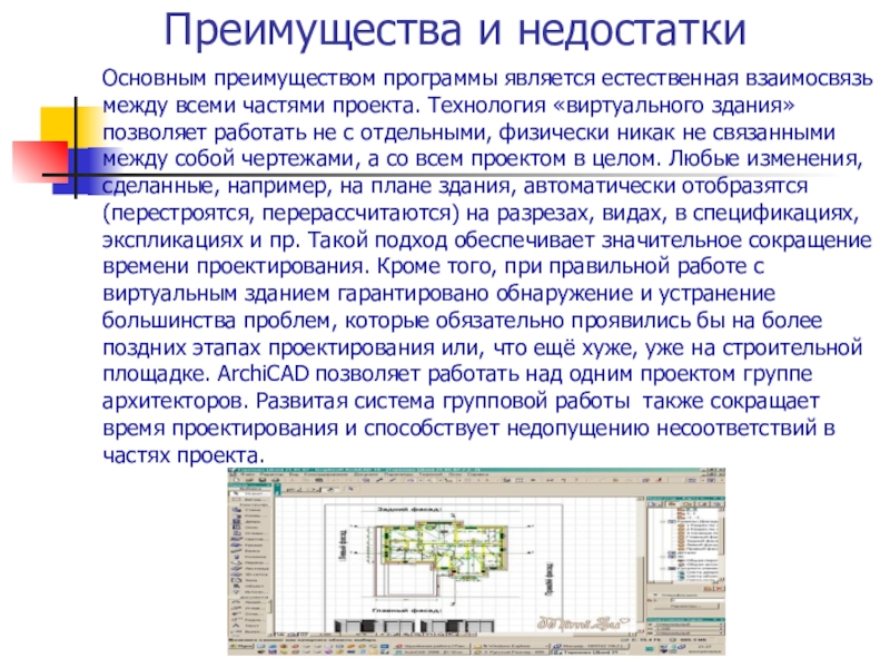 проекта. Технология «виртуального здания» позволяет работать не с отдельными, физически никак не связанными между собой чертежами, а со всем проектом в целом. Любые изменения, сделанные, например, на плане здания, автоматически отобразятся (перестроятся, перерассчитаются) на разрезах, видах, в спецификациях, экспликациях и пр. Такой подход обеспечивает значительное сокращение времени проектирования. Кроме того, при правильной работе с виртуальным зданием гарантировано обнаружение и устранение большинства проблем, которые обязательно проявились бы на более поздних этапах проектирования или, что ещё хуже, уже на строительной площадке. ArchiCAD позволяет работать над одним проектом группе архитекторов. Развитая система групповой работы также сокращает время проектирования и способствует недопущению несоответствий в частях проекта.